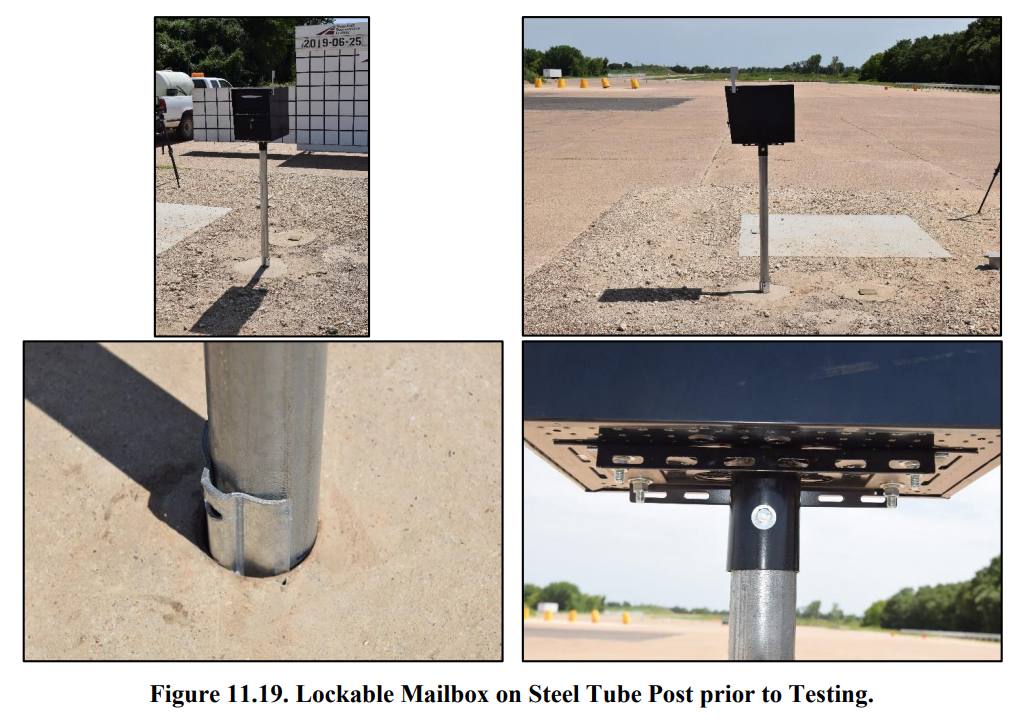 Description: This system consisted of a lockable mailbox attached to a galvanized thin-wall steel tube support secured inside a 12-gauge galvanized anchor socket embedded in a concrete footing. The bottom (floor) of the mailbox was mounted 42 inches above grade. Details of this system are described in Maintenance Division standard MB-15(1). The Oasis Jr. Elite lockable mailbox (Model #620010B-10) had approximate dimensions of 15 inches tall by 12 inches wide by 18.1 inches deep and weighed 23 lb. Attachment of the mailbox to the post was accomplished using a mailbox bracket with an integral collar (DHT #161443). The bracket was secured to the bottom of the mailbox using four ⅜-inch-diameter by 1¼-inch-long SAE Grade 5 hex bolts, two 2-inch by 5½-inch by ⅛-inch ASTM A36 plate washers, and associated hardware. The collar on the mailbox bracket was positioned over and secured to the top of the support post using a 5/16-inch-diameter by 3-inch-long SAE Grade 5 hex bolt with associated hardware. The support post was a 2⅜-inch-outside-diameter by 0.095-inch-thick galvanized thinwall steel tube (DHT #143426). The support post was inserted approximately 8 inches into a 2⅜-inch-outside-diameter by 0.125-inch-thick galvanized thin-wall steel tube socket (DHT #143434) and secured with a curved steel wedge plate (DHT #143433) on the impact side. The socket was embedded 27 inches deep and installed flush with the top of a TxDOT Type 2 nonreinforced concrete footer that measured approximately 12 inches in diameter by 30 inches deep.