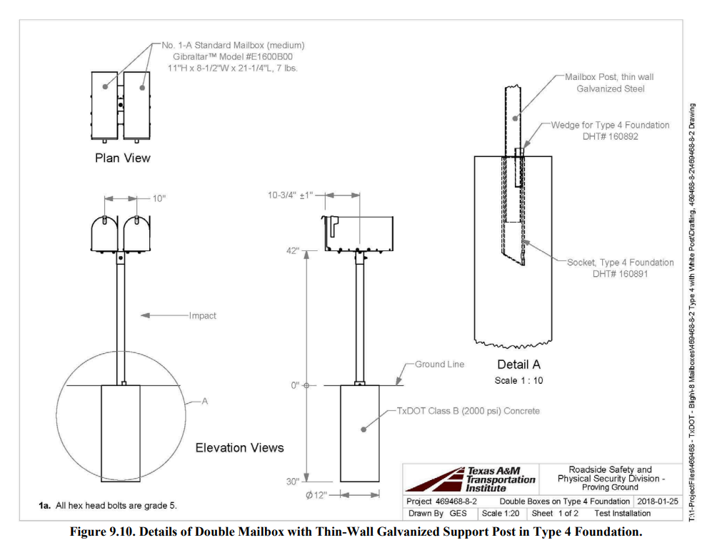 Description: Two Elite No. 1-A (Model #E1600B00) standard arched-top medium size mailboxes from Solar Group, Inc., a division of Gibraltar Industries, were attached to the top of a galvanized, thin-wall steel support post at a height of 42 inches above grade. The mailboxes, which weighed 7 lb, had approximate dimensions of 11 inches tall × 8¾ inches wide × 21½ inches deep. A mailbox bracket (DHT #161443) and extension bracket (DHT #148938) was attached to the bottom of each mailbox using SAE grade 5 bolts, nuts, and washers. Attachment of the Elite mailboxes to the post was accomplished using a bracket (DHT #162323) that consisted of a horizontal steel plate and tubular socket. The mailboxes were bolted to the horizontal plate at a center-to-center spacing of 10 inches. The bracket socket was then placed over the end of the support post and secured using a ⅜-inch diameter × 3½-inch long SAE grade 5 hex bolt, flat and lock washers, and nut. The galvanized steel support post (DHT #143426) was fabricated from 2-inch nominal 16 gauge (2⅜ inches outside diameter × 0.109-inch wall thickness) thin wall ASTM A513 Type 5 DOM steel tubing. The support post, which had a length of 57 inches and weighed 7.5 lb, was inserted into a Type 4 foundation socket (DHT #160891) and secured with a tapered semicircular HDTP wedge (DHT #160892) on the impact side. The foundation socket was installed flush with the surface of a 12-inch diameter × 30-inch deep unreinforced concrete foundation. The concrete was specified as TxDOT Class B having a minimum 28-day unconfined compressive strength of 2000 psi. The total mass of the two mailboxes, connection hardware, and support post assembly was 31 lb.