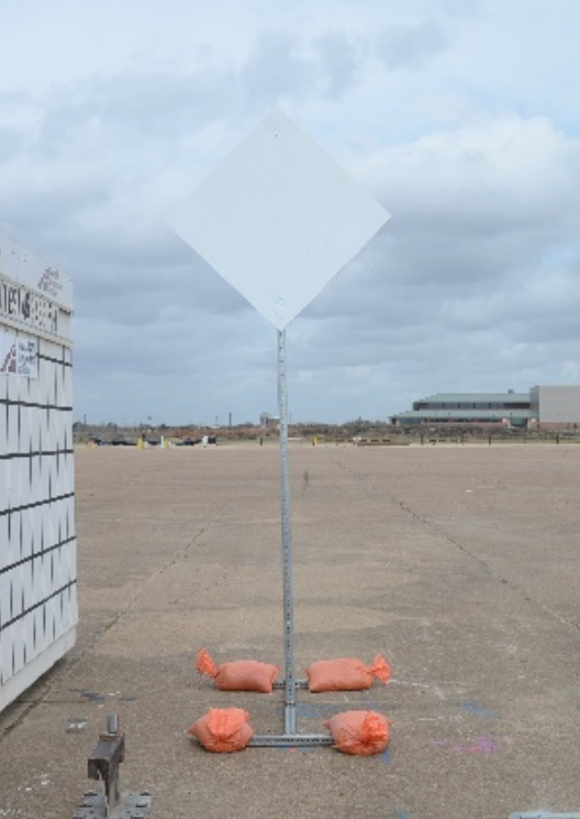 Description: These test installations consisted of three main parts. A 36-inch square extruded, hollowcore plastic sign panel was secured to an approximately 11 ft long section of 1¾-inch square perforated steel tubing with two hex bolts with fender washers under the head of the bolt. This tubing was inserted into a 4-ft long sleeve fabricated from 2-inch square perforated steel tubing and secured with a bolt, nut, and fender washers such that the bottom corner of the sign was approximately 84 inches above grade. The sleeve was welded to an I-shaped skid fabricated from 1¾-inch and 2-inch square perforated steel tubing. All square perforated tubing was 12 gauge. Excluding the four 40-lb sandbags, the test article weighed 63 lb. The skid-mounted sign support systems were placed on a concrete apron but were not secured to it. The installation for Test No. 469468-7-1 was placed with the sign panel perpendicular to the vehicle path. For Test No. 469468-7-2, the sign panel was oriented parallel to the vehicle path.