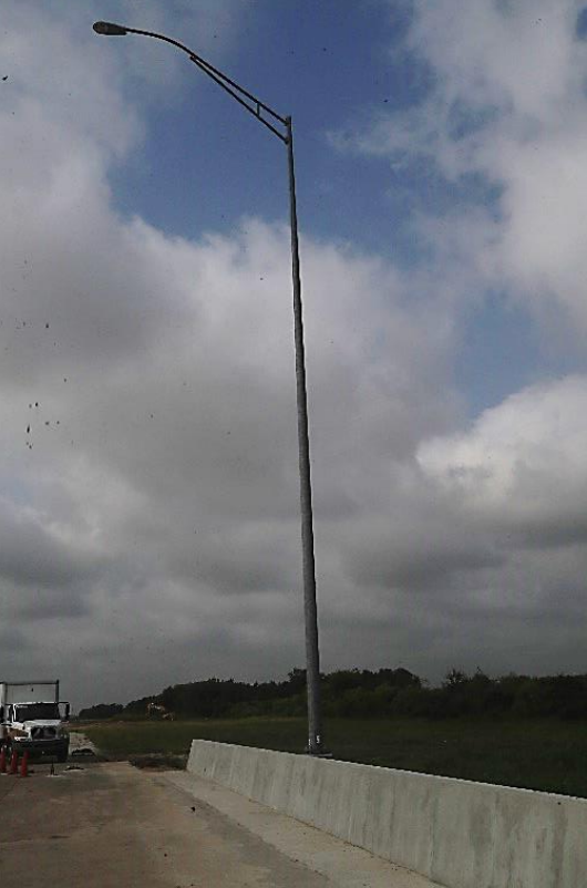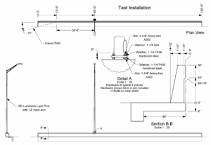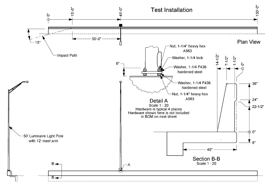 Description: The test installation was 130 feet long and consisted of a 36-inch-tall SSTR anchored to an 8-inch thick, 40-inch-wide cantilevered concrete deck. A 21-inch-wide, 21-inch-deep, and 36-inch-tall concrete block was monolithically poured onto the back of the barrier at a distance of 45 feet from the upstream end. A 50-foot-tall steel luminaire pole with a single 12-foot steel mast arm and LED luminaire was mounted onto the top of this concrete block behind the bridge rail. The barrier, deck, and luminaire mounting block were all reinforced with grade 60 rebar.