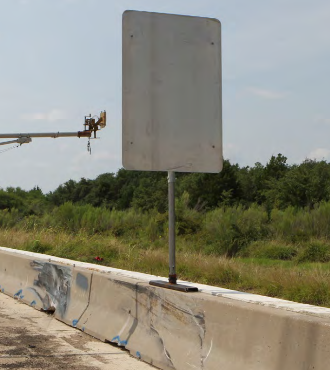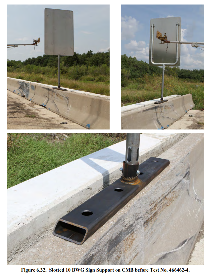 Description: The installation for test 466462-4 uses the same post mounting assembly incorporated in test 46646-1 except for the sign post. The sign post is 10 BWG with four symmetrical 3-inch long slots placed around the post just above the schedule 40 collar. There is a bushing between the post and the collar on the ¾-inch bolt that goes though the sign post and the collar. This bushing helps reduce the post from vibrating within the collar