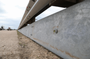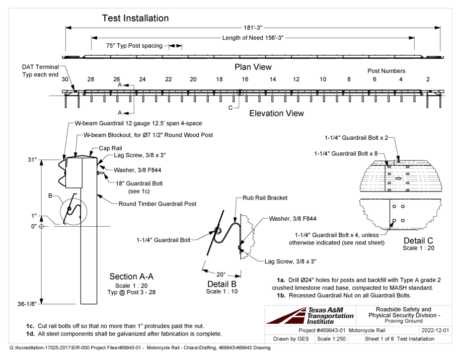 Description: The test installation was 181 ft 3 inches long, with a DAT terminal at each end. It consisted of 156 ft 3 inches of timber posts and 14-inch tall blockouts, spaced at 75 inches, which supported a W-beam traffic rail, a rubrail below the W-beam, and a cap rail that covered the top of the posts and blockouts. The top edge of the W-beam was at 31 inches above grade. The 7½-inch diameter timber posts were 68 inches long, with a flat top instead of domed. The bottom edge of the rubrail was 1½ inches above grade for the 469940 tests and 1 inch above grade for the 469942 and 466943 tests. A bracket made of a bent plate secured the rubrail to the posts. The rubrail was parallel to the posts for the 469940 tests, at 10 degrees for the 469942 test, and at 20 degrees for the 469943 tests. The rubrails for the 469940 tests were 12 ft 10 inches long, with two bolts at each joint. The rubrails for the 469942 and 469943 tests were 13 ft 2 inches long, with four bolts at each joint. They were 14¾ inches wide for all tests. The channel rubrail with a 10-degree incline was selected for further evaluation through full-scale crash testing.