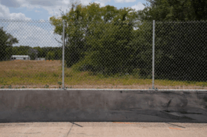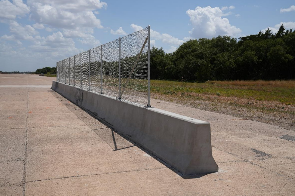 Description: The installation consisted of a 100-ft long section of a cast-in-place F-shape concrete barrier, with an 80-ft long section of chain-link fence mounted on top and approximately centered on the F-shape barrier. The F-shape barrier was 32 inches tall, 24 inches wide at its base, and sloped upward on both sides for a final width of 9½ inches at the top of the barrier. The chain-link fence was 72 inches tall and was secured to the posts, which were spaced at 96 inches. The posts were affixed to the barrier by threaded ⅝-inch diameter rods secured in the concrete with epoxy.