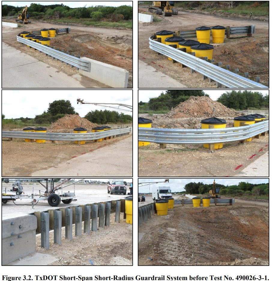 Description: Each test installation consisted of a 31-inch tall, thrie-beam short-radius guardrail system constructed with the 27-ft-7½-inch long primary-road leg (as measured along the guardrail) that transitioned to a section of bridge parapet, and an 18-ft-9-inch long secondary-road leg that terminated with a rounded thrie-beam end section (RTE02a) that is attached a stiff pipe that can rotate around the vertical axis. The curved 12-ft-6-inch (post-to-post) arc length thrie-beam section (RTM02a) was rolled to an 8-ft-4½-inch inside radius. The primary-road side thrie-beam of the system was flared to the field side 4¼° from the tangent line of the parapet face, and the secondary-road side thrie-beam was perpendicular to the parapet face tangent. Six sand barrels were strategically placed on the inboard, field side of the installation. A pit was constructed on the field side of the installation. The upper edge of the pit was located 5 ft behind and parallel to the inside of the guardrail. The pit was 18 ft wide × 6 ft deep with a 3:1 slope on the face. The end anchor on the secondary roadway and the modified Breakaway Cable Terminal (BCT) foundation tube were analyzed and designed to withstand expected loads due to vehicular impact. The simulated parapet section was not designed for direct impact by a vehicle.