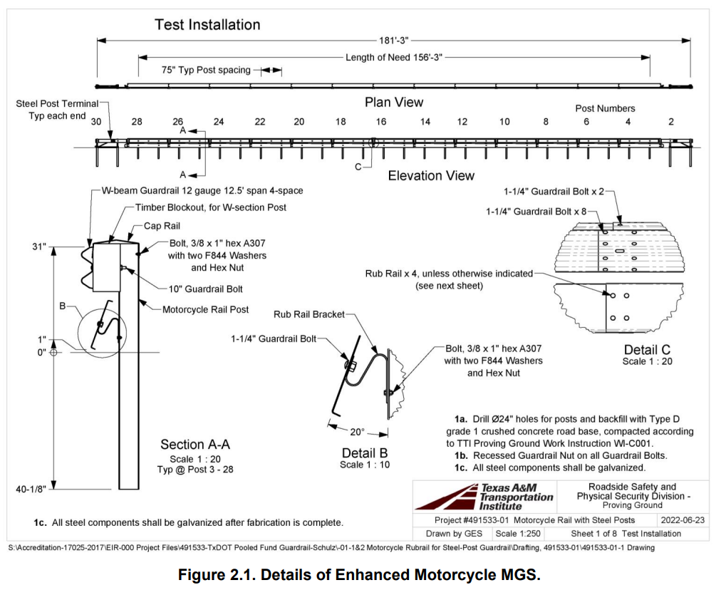 Description: The installation consisted of a guardrail system with a standard four-space W-beam guardrail secured to the top of the rail 31 inches above grade by steel 72-inch W6×8.5 posts and wood blockouts. A series of 12-ft 10-inch-long, 14¾-inch-wide rub rails were located just below the W-beam such that the bottom was 1 inch from grade and were held away from the posts by a rub rail bracket at a 20-degree angle. A series of 12-ft 10-inch-long and 15-inch-wide cap rails were placed over the top of the guardrail posts and blockouts. The posts were evenly spaced at 75 inches, with a consistent embedment of 36⅛ inches, and the W-beam and both rails ran the entire length of need of 156 ft 3 inches. The installation was capped on both ends by a steel post terminal system, for a total installation length of 181 ft 3 inches.