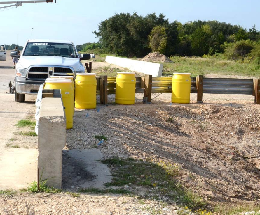 Description: A 31-inch tall short radius system was developed and tested per MASH TL-2 modified conditions, by increasing the impact angle to 25° from 15°, and is considered MASH complaint per the MASH evaluation criteria. This new short radius system requires a thrie-beam guardrail system constructed along the primary roadway that transitioned to a section of bridge parapet. The thrie-beam is curved at the nose section and then is attached to a w-beam rail via an asymmetric thrie to w-beam connector. The w-beam rail is attached with a TxDOT GF (31) DAT-14 terminal at the secondary roadway end. The curved 25-ft arc length thrie-beam section was rolled to a 16-ft inside radius, and it has 11-inch long slots on the nose section of the curved thrie-rail. Six sand drums were strategically placed on the inboard, field side of the installation between posts 9 and 15 as illustrated in the test installation drawings. The impact performance of the short radius guardrail system with a 3H:1V slope was evaluated using modified MASH Tests 2-33, 2-32 2-31, 2-35, and 2-34 that were conducted successfully. For Test Nos. 469137-3-1 and -3-2 (MASH 2-33 and 2-32), standard BCT Anchor Cables (FCA01) measuring 6 ft-6¾ inches end to end, inclusive of terminal fittings, were used. Due to the cables being longer than required, the Guardrail Anchor Brackets (FPA01) were repositioned and attached to the thrie-beam with four bolts instead of eight. For Test Nos. 469138-3-3, -3-4, and 469138-3-5 (MASH 2-31, 2-35, and 2-34, respectively), modified BCT Anchor Cables measuring 5 ft-5 inches end to end, inclusive of terminal fittings, were used. These shortened cables allowed the Guardrail Anchor Brackets (FPA01) to attach to the thrie-beam with eight bolts.