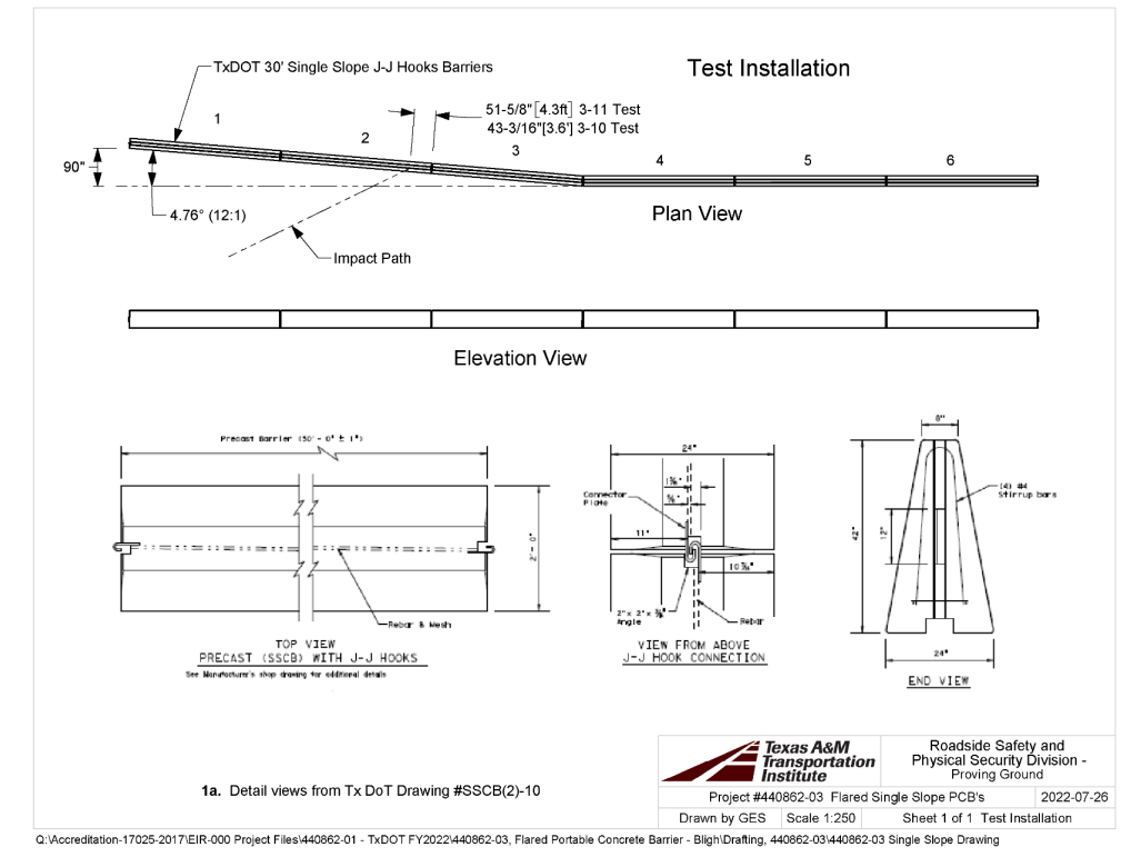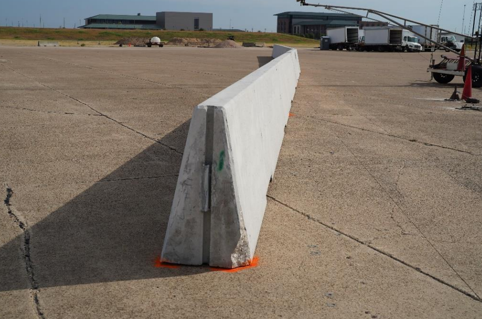 Description: The test installation consisted of six 30-ft long single-slope steel-reinforced concrete barriers with J-J Hooks connections. The barriers were 8 inches wide at the top, 24 inches wide at the bottom, and 42 inches tall. The first three barriers on the upstream end were offset from the other three by 4.62 degrees (12:1) so that the upstream end of the first barrier was offset from the last three by approximately 90 inches. The barriers were set directly on the concrete apron without any restraints that would restrict movement