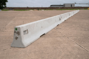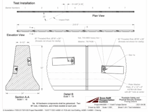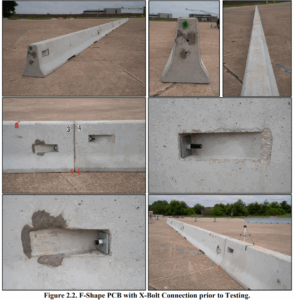 Description: The test installation consisted of seven 30-ft-long precast steel reinforced portable concrete barrier (PCB) segments placed end to end, for a total length of 210 ft. The barriers were connected to each other using two 29-inch-long sections of a ⅞-inch-diameter B7 threaded rod and associated hardware at each joint. The threaded rod passes through PVC pipe cast into the ends of the barrier segments at two different elevations that form an “X” in plan view. Recesses were cast in the exterior faces of the barriers so that the ends of the threaded rod and associated hardware did not protrude past the exterior faces. All barriers were freestanding (not secured to the concrete apron). The barrier segments measured 24 inches wide at bottom, 9½ inches wide at top, and 32 inches tall. The traffic and field side faces were symmetric, with an F-shape profile.