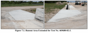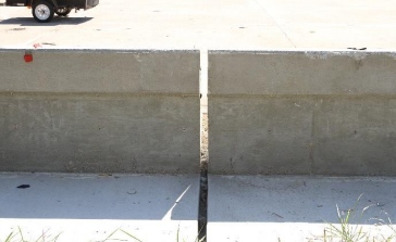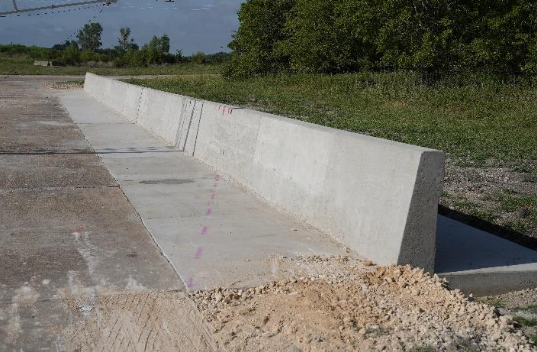 Description: The installation consisted of three sections of 36-inch-tall concrete SSTR. Two of the sections were 25 ft. in length, and the third section, placed on the left end when viewing from the traffic side, was 74 ft. 9¾ inches long. There was a 2-inch joint between each barrier section, which resulted in a total length of 125 ft. 1¾ inches. The SSTR was anchored in place using No. 4 rebar anchors embedded in a cast-in-place concrete slab measuring 4½ inches thick. The rebar anchors rested on the top surface of precast concrete panels that were 8 ft. 4 inches long, 10 ft. wide, and 4 inches thick. The upper concrete slab was then cast in place over the precast concrete panels to simulate field construction. Test No. 469680-02-3, the concrete apron was extended downstream of the barrier to replace the soil beyond the end of the barrier to provide a more uniform and representative runout area.