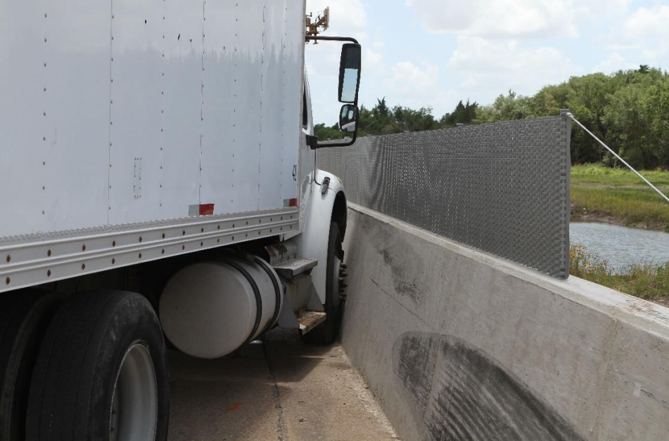 Description: Crash Test No. 440822-01-2 The installation consisted of a 100-ft long section of a cast-in-place single-slope concrete median barrier, with an 81-ft 3-inch section of Screen-Safe® glare screen and work-zone safety shield mounted on top, starting approximately 112 inches from the upstream end of the singleslope barrier. The single-slope barrier was 42 inches tall, 24 inches wide at its base, and sloped symmetrically upward on both sides for a final width of 8 inches at the top of the barrier. The Screen-Safe® glare screen was split into two sections. The upstream section was 25 ft long, and the downstream section was 50 ft long. Each end of the screen was anchored with a 6-ft 7-inch long anchor cable attached from the top of the end posts to an eyebolt anchored to the top of the single-slope barrier. The glare screen was a double-reverse corrugated steel screen fabric that stood 24 inches above the top of the single-slope barrier and was affixed to the barrier by threaded 26-inch long post bolts that were screwed into wedge anchors installed in the top of the concrete barriers.