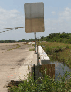 Description: The sign post is a standard 2.5-inch diameter Schedule 80 post. The post is mounted inside a 6-inch long, 3-inch diameter schedule 40 pipe that is built inside a 6-inch wide × 2-inch deep × ¼-inch thick steel tubing. The post is secured to the pipe using a ½-inch diameter through bolt. The steel tubing is 48 inches long with a 45-degree taper at each end and fixed to the top of the concrete barrier using four 8-inch long, ¾-inch diameter anchor rods.
