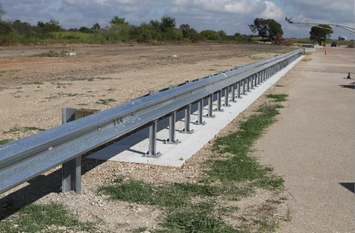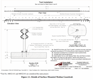 Description: The test installation consisted of a weak-post, median W-beam guardrail system spanning 187 ft-7¼ inches (posts 5 through 63) before transitioning to a single-sided standard strong-post W-beam guardrail system and a guardrail end-terminal (posts 1 through 4 and 64 through 67) on each end of the installation. The total length of the installation was 239 ft-5 inches. The posts of the median guardrail were comprised of S3x5.7 steel welded to baseplate plates measuring 8×8×⅝ inch thick. The posts were spaced evenly at 37½ inches and were mounted onto an unreinforced 8-inch-thick concrete slab using Hilti HIT-RE500 V3 epoxy anchors. The concrete slab extended for 184 ft-0 inches onto which the 59 posts for the weak-post median guardrail were secured. Two standard W-beam rail elements were attached on each side of the S3x5.7 posts. A backer plate was placed between the post and the W-beam rail element on each side, except for the posts at the rail splice locations. The top of the rail was 31 inches above the top of the concrete slab. Each end of the weak-post median guardrail transitioned to standard strongpost W-beam guardrail and was terminated with an abbreviated, 4-post SoftStop® guardrail end terminal as anchorage for these tests only.