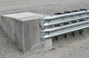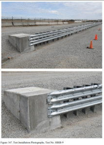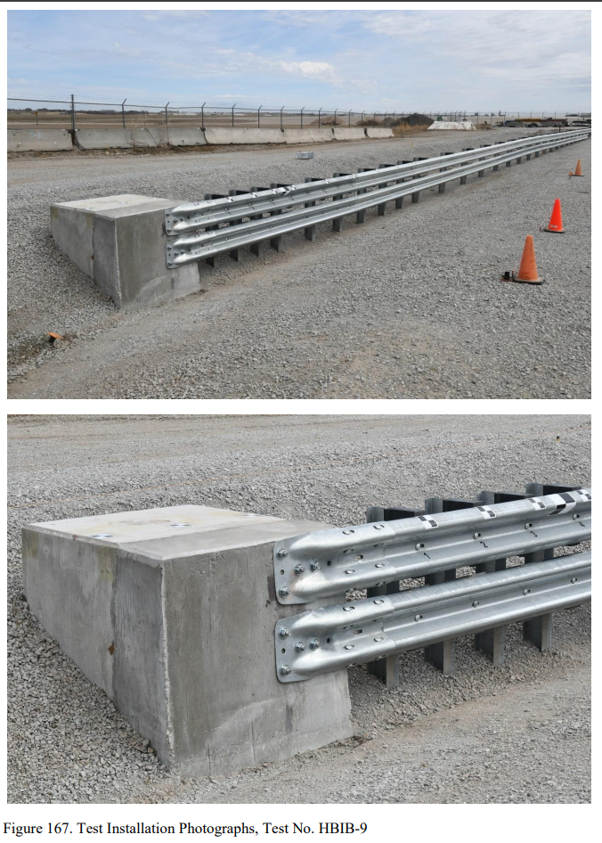 Description: Hawaii DOT typically uses two configurations of a flared buried-in-backslope system design. The first configuration consists of a single flare extending from the tangent guardrail system, terminating at a rigid anchor block. The second configuration utilizes a secondary flare at adjacent to the end anchorage. The primary flare of the rail has flare rates selected based on the design speed of the barrier system and roadway, whereas the secondary flare is fixed at 7.4:1 with respect to the tangent roadway. A full evaluation was performed with MASH test designation nos. 3-32, 3-33, 3-34, 3-35, and 3-37a and 3-37b on the HBIB system with dual-flare configuration. The dual flare was most severe for standard traffic direction crashes, but would be less severe when used in trailing-end or reverse-direction crashes. This was because the secondary flare of the dual-flare system had a larger flare rate away from the roadway. For standard-direction impacts, the secondary flare rate contributes to a higher effective impact angle; for reverse-direction impacts, the secondary flare decreases the effective impact angle. Thus, the single-flare configuration was believed to be more severe in reverse-direction configurations. The system was modified to represent the single-flare configuration. This was accomplished by extending the transition post nos. 1 through 8 with the single-flare configuration (4.4-degrees or 13:1), and placing the anchor block adjacent to the bottom toe of the V-ditch. The resulting system had a 13:1 flare rate between the anchor block and post no. 29. The same reinforced concrete block was used for the single-flare configuration as was used for the dual-flare configuration. To accommodate the difference in anchor positions, a built-up “cap” was added to the front face of the concrete anchor block so that the rail would be terminated at the block and in line with the single flare. The cap consisted of a trapezoidal shape, as shown in Figure 145 measuring 12¾ in. on the downstream side and 14½ in. thick on the upstream side. Note that for purposes of this discussion, downstream refers to nominal travel direction, not the direction of reverse-direction impact. The trapezoidal cap was doweled into the face of the existing concrete anchor block with bent no. 4 bars and epoxied to a depth of at least 6 in. Additionally, researchers selected post-installed attachments to secure the W-beam end shoe to the reinforced cap instead of cast-in ferrule assemblies. All other system details were the same for the single-flare configuration evaluated during test no. HBIB-9. The system installation for test no. HBIB-9 is shown in Figures 132 through 169, and material specifications, mill certifications, and certificates of conformity for the system materials are provided in Appendix D